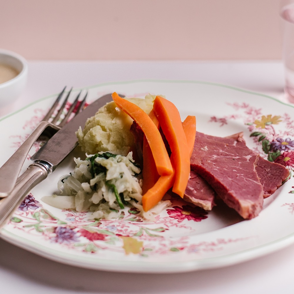 Slow cooked corned beef with creamy mashed potato, cabbage, carrots and mustard sauce. A classic dish ideal for one person.