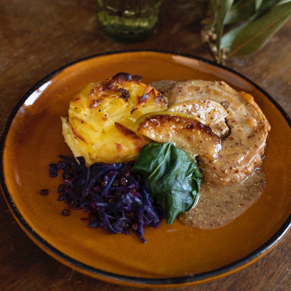 Slow cooked Pork Belly with a mustard gravy, apple, potato gratin, green beans and braised red cabbage.